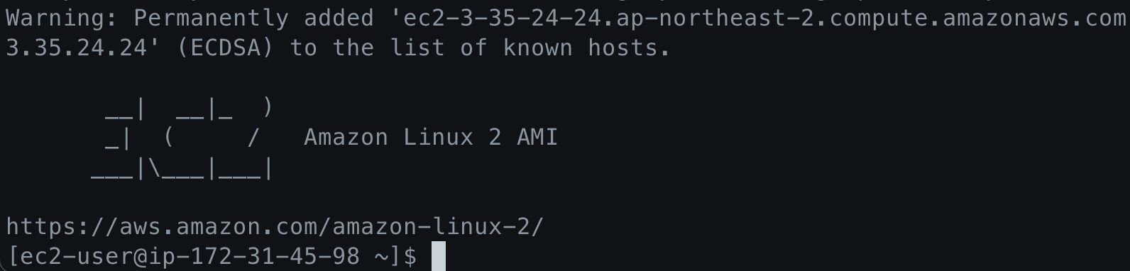 다음으로 위 4번 설명처럼 터미널에 입력하면 ec2에 접속할 수 있습니다.
