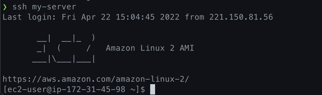 다음과 같이 ssh [Host]를 입력하면 간단하게 어디에서도 ec2에 접근할 수 있습니다.