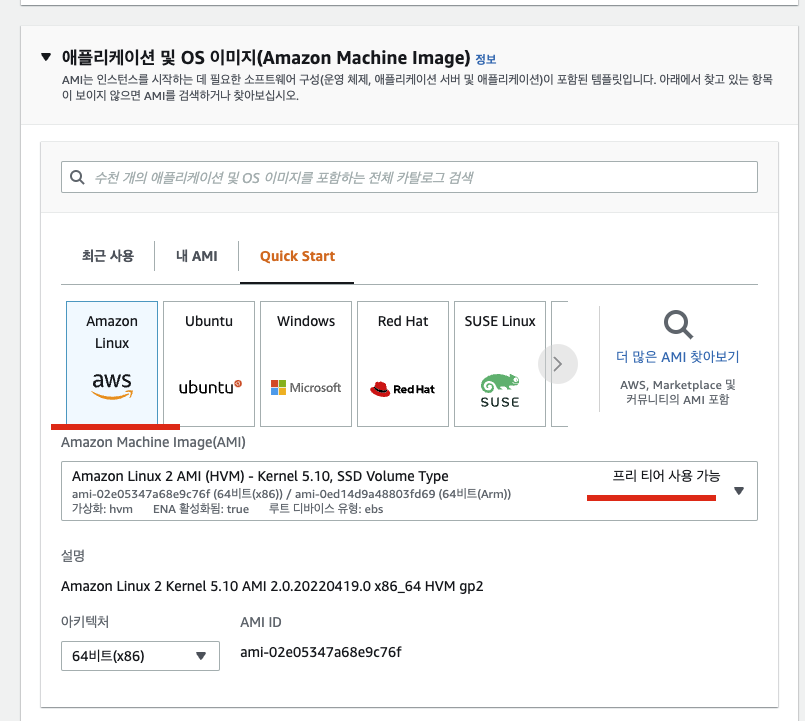 Amazon Linux가 아니더라도 '프리 티어 사용 가능'한 다른 이미지를 선택하면 됩니다.