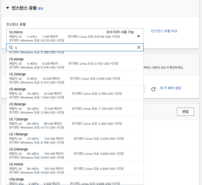 인스턴스 유형은 인스턴스 생성할 때 고를 수 있고, 다음과 같이 이름의 첫 글자와 '패밀리'로 인스턴스 유형을 확인할 수 있습니다.