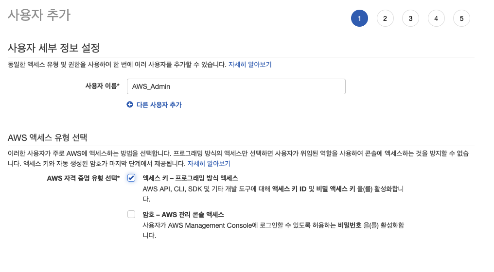 사용자 이름을 임의로 입력하고 "프로그래밍 방식 액세스"를 선택합니다.