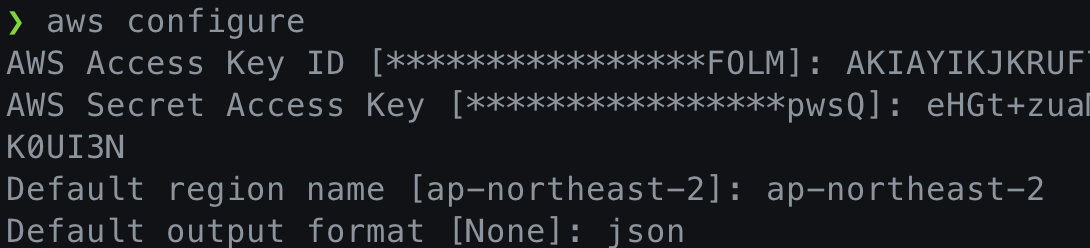 Default Region name은 "ap-northeast-e", default output format은 "json"을 입력합니다.