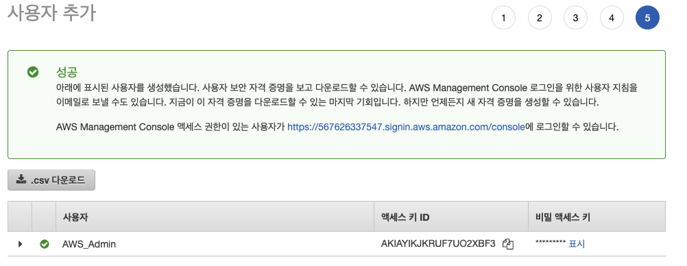 .csv 다운로드를 클릭해 인증정보를 다운로드합니다