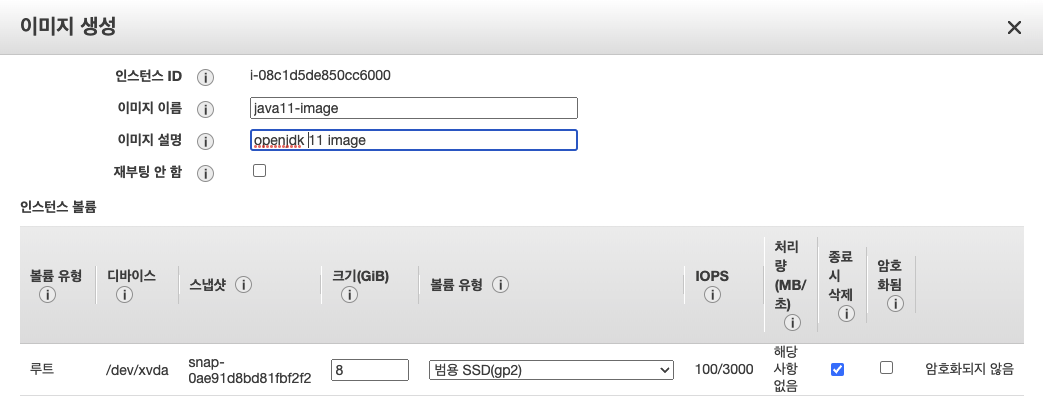 ec2 콘솔 창에서 기존 ec2에 오른쪽 버튼을 클릭한 이후 "이미지" -> "이미지 생성"을 클릭합니다.
