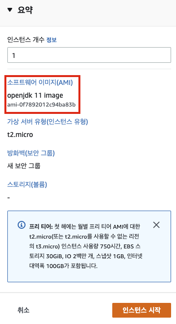 "요약" 창에서 보이다시피 이전에 만든 AMI를 기반으로 인스턴스 만듭니다.