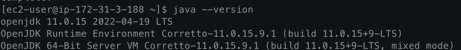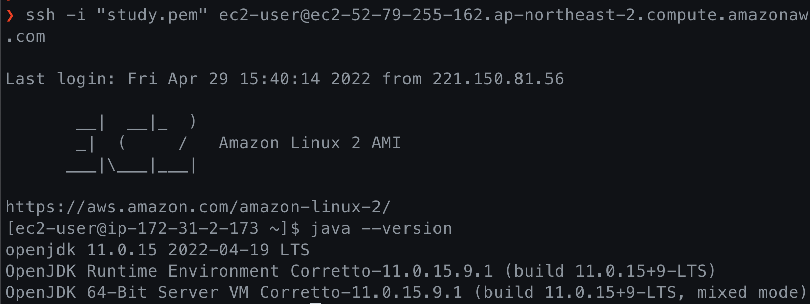 다음처럼 백업한 인스턴스에 ssh 접속을 하면 Amazon Linux 2 기반에 java11이 설치가 된 것을 확인할 수 있습니다.