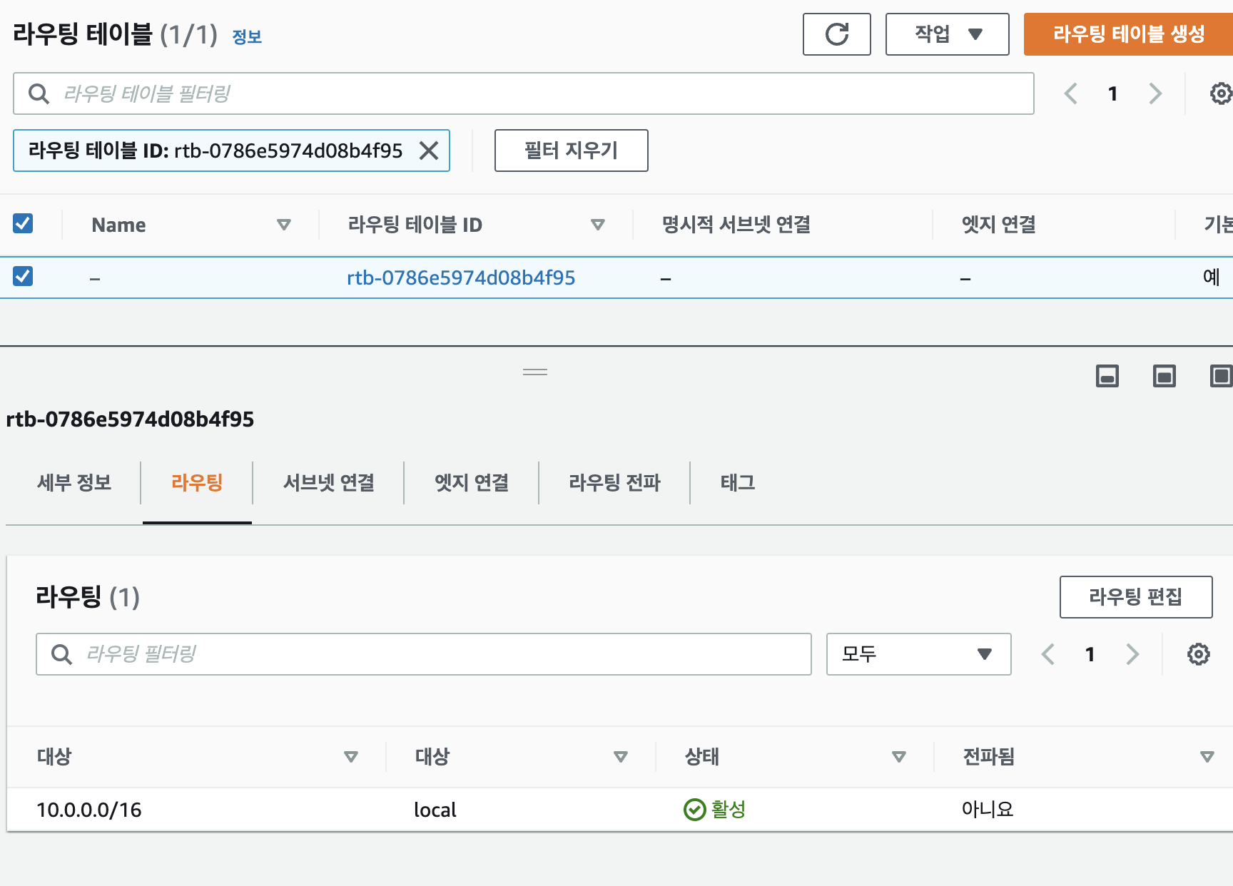 라우팅 탭을 선택하면 VPC 내부 연결을 위한 규칙(local)만 있는 것을 확인할 수 있습니다.