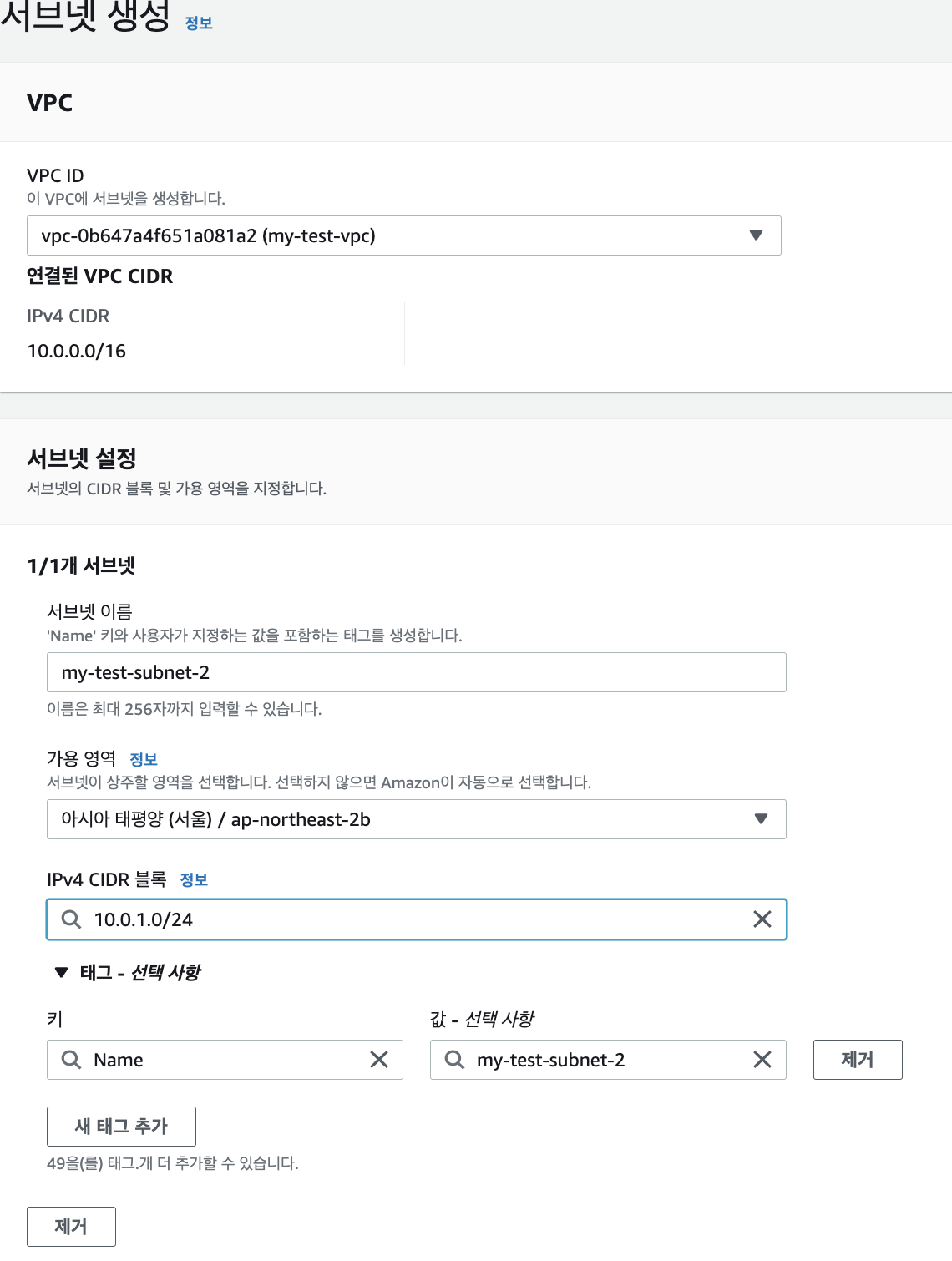같은 방법으로 가용존 ap-northeast-2b, CIDR 블록 10.0.1.0/24을 가진 서브넷을 하나 더 만듭니다.