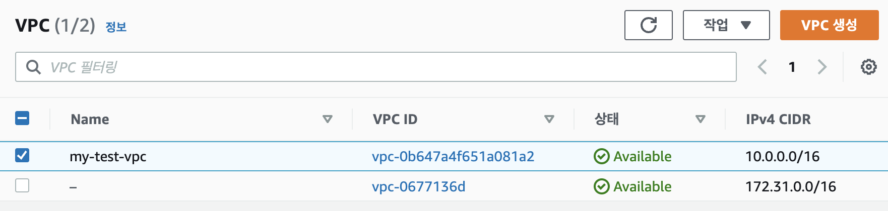 'my-test-vpc' 밑에 있는 VPC는 AWS 계정을 생성할 때 기본적으로 생성된 VPC입니다. 현재 글에서는 사용을 안할 거니 참고하기면 됩니다.