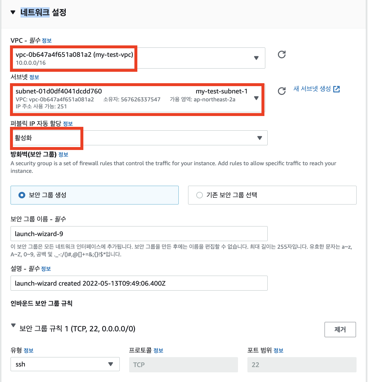 이 인스턴스에 외부에서 접속을 하려면 퍼블릭 아이피를 할당할 필요가 있습니다. 따라서 '퍼블릭 IP 자동할당'을 '활성'로 지정합니다