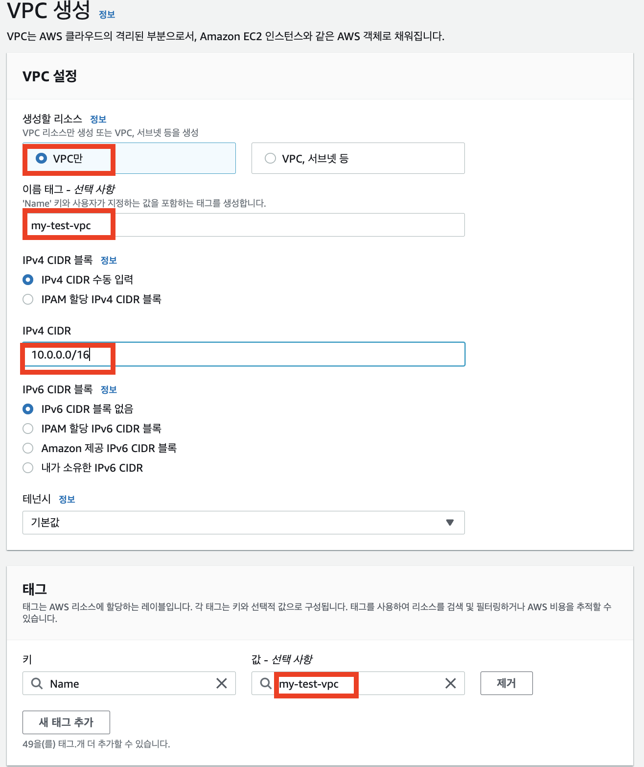 여기서는 이름 태그를 'my-test-vpc', IPv4 CIDR 블록을 10.0.0.0/16으로 지정하겠습니다. 이렇게 설정하면 'my-test-vpc'란 이름을 가진 vpc 안에서 10.0.0.0 ~ 10.0.255.255의 ip를 사용할 수 있습니다.