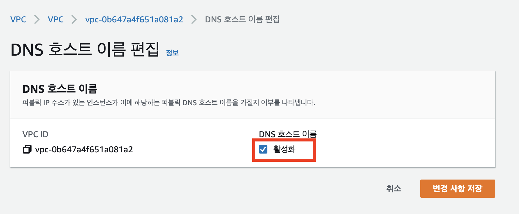 VPC를 선택 > 오른쪽 위의 작업 > 'DNS 호스트네임 편집'을 선택해 이 기능을 활성화해줍니다.
