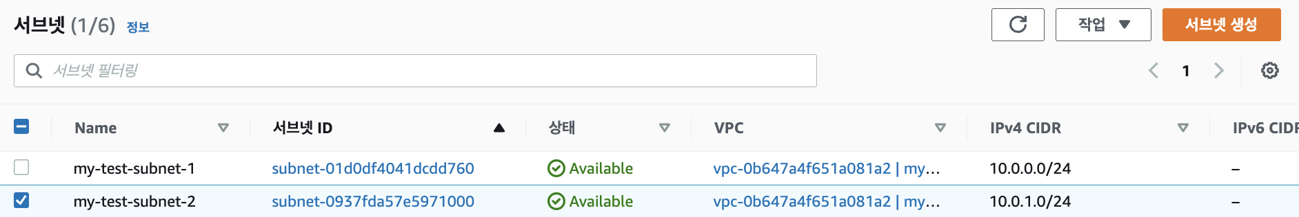 생성이 완료되면 다음처럼 서브넷 2개가 생성된 것을 확인할 수 있습니다.