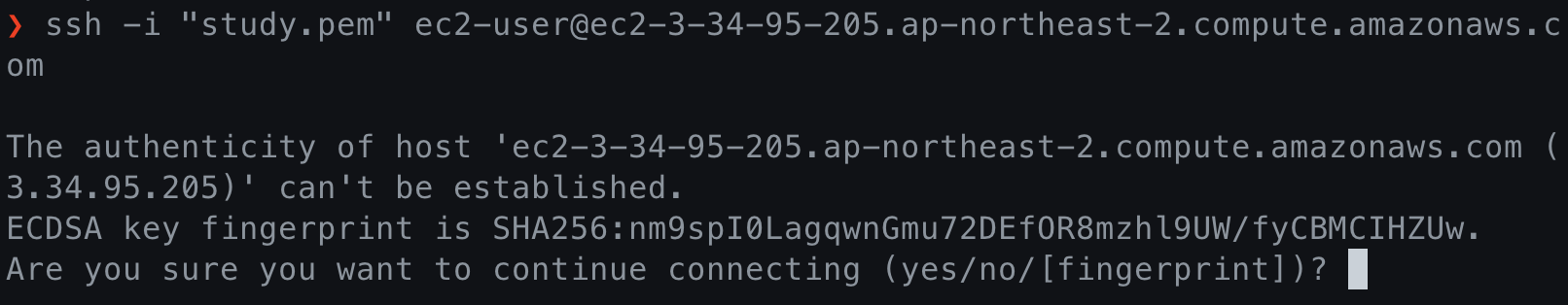 이제 모든 조건을 만족했습니다. 다시 ssh를 사용해 이전에 만들었던 인스턴스에 다시 접속해봅니다.