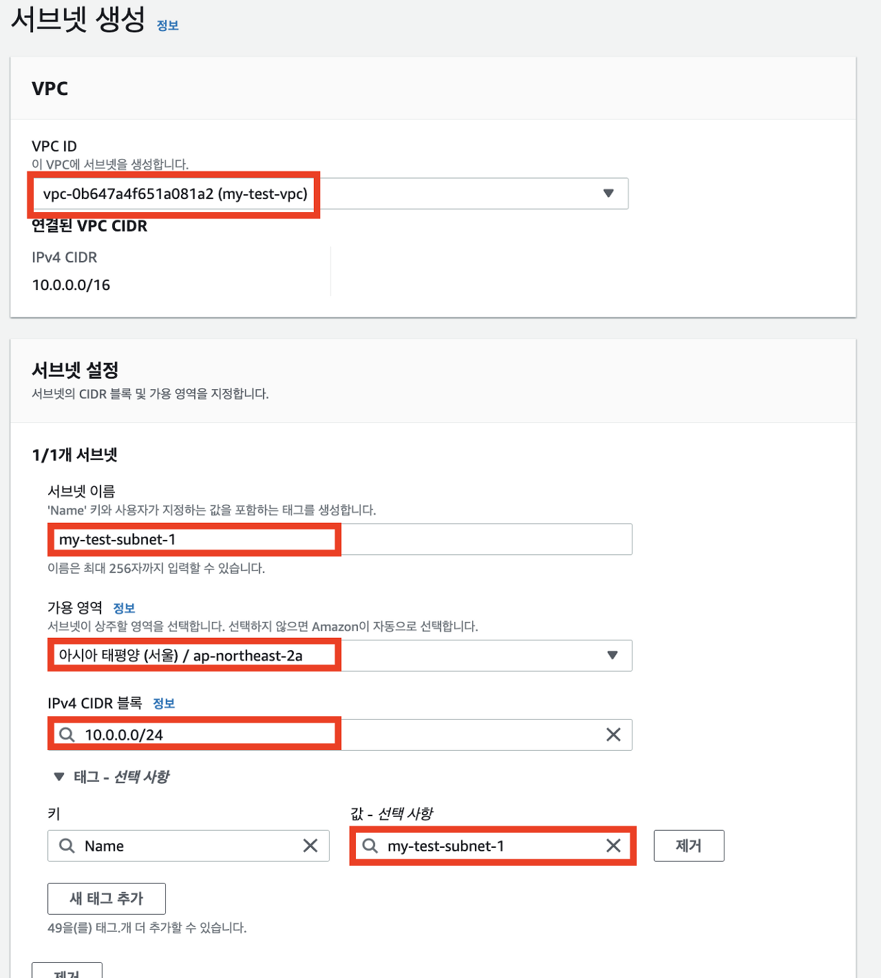 - VPC는 앞서 생성한 VPC ID('my-test-vpc')를 찾아서 선택합니다.