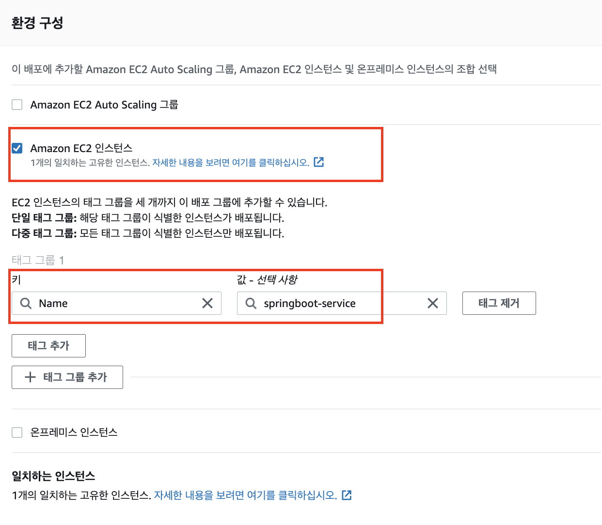 현재 프로젝트의 경우 EC2 하나만 배포하면 되므로 배포 유형- 현재 위치, 로드 밸랜서- 비활성화 설정을 해두었습니다.