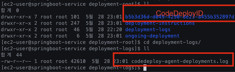 - CodeDeploy 로그 파일: 작성한 echo 내용 및 배포 중 표준 입출력 내용 모두 담겨있음