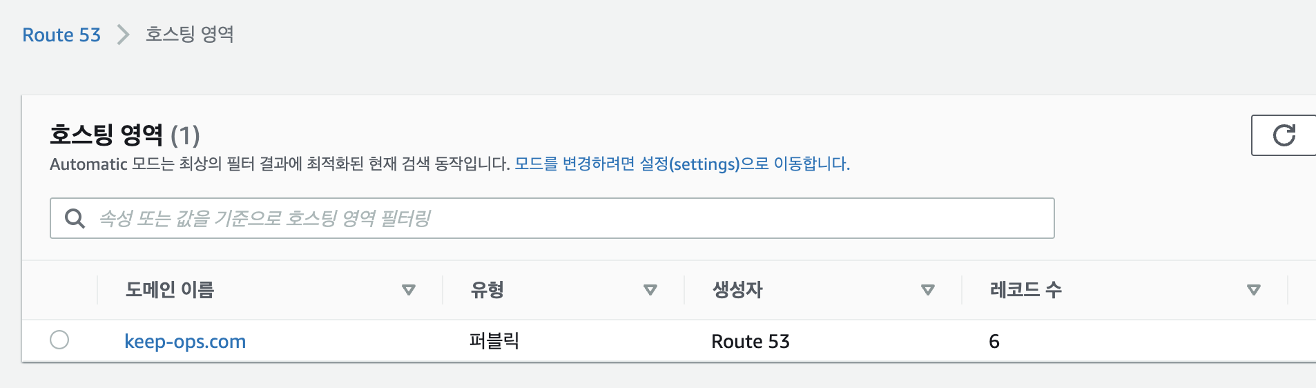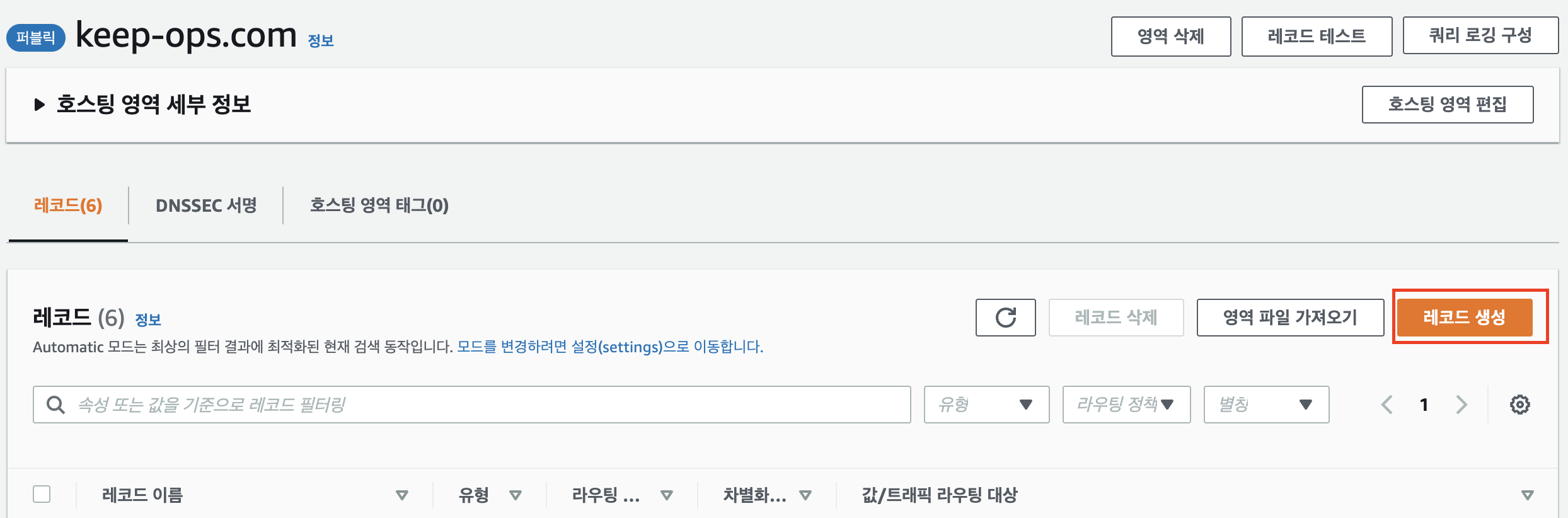 등록된 이후에 호스팅 영역을 들어가면 Route 53에 의해서 도메인 이름이 자동으로 생긴 것을 볼 수 있습니다.