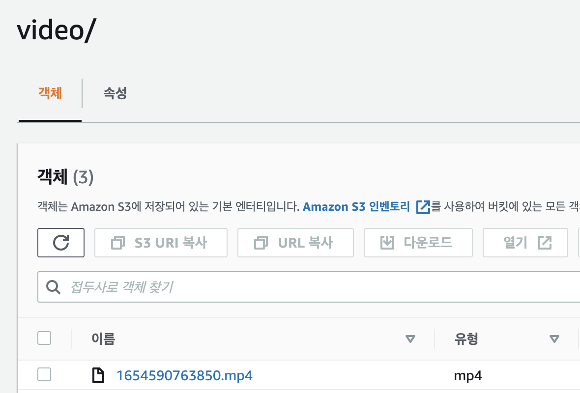 S3에 mp4 파일이 잘 저장된 것을 확인할 수 있습니다.
