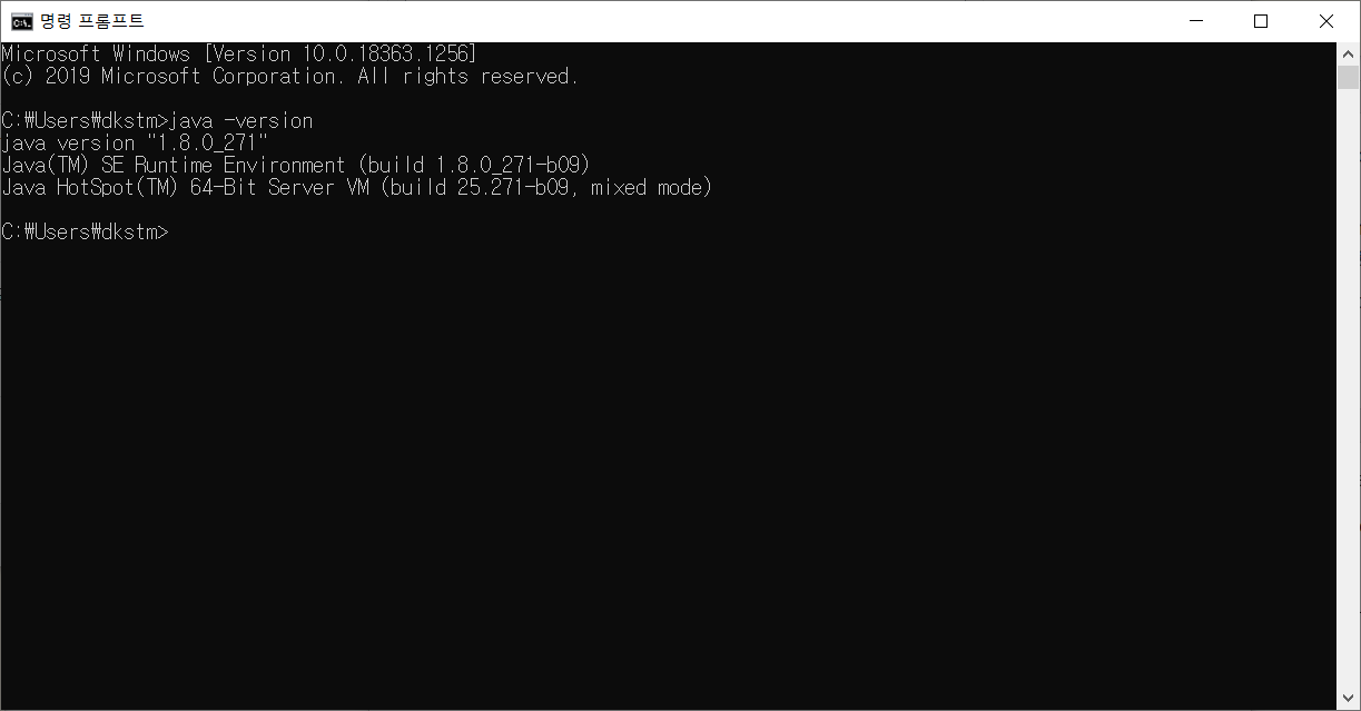 cmd를 켜서 java -version을 입력해서 자바가 정상적으로 설치되었는지 확인합니다.