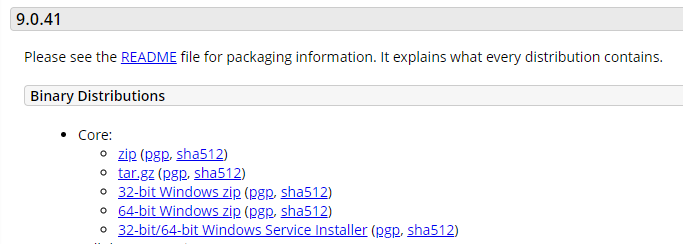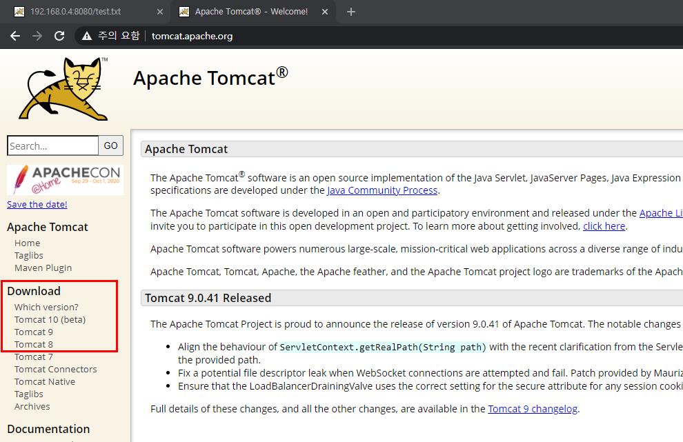 톰캣 9에서 가장 최신 버전은 9.0.41인 것을 확인할 수 있습니다.
