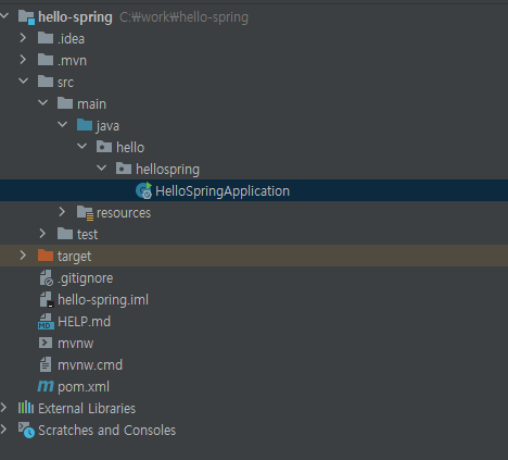 HelloSpringApplication은 방금 저희가 만든 Spring Boot 애플리케이션입니다.