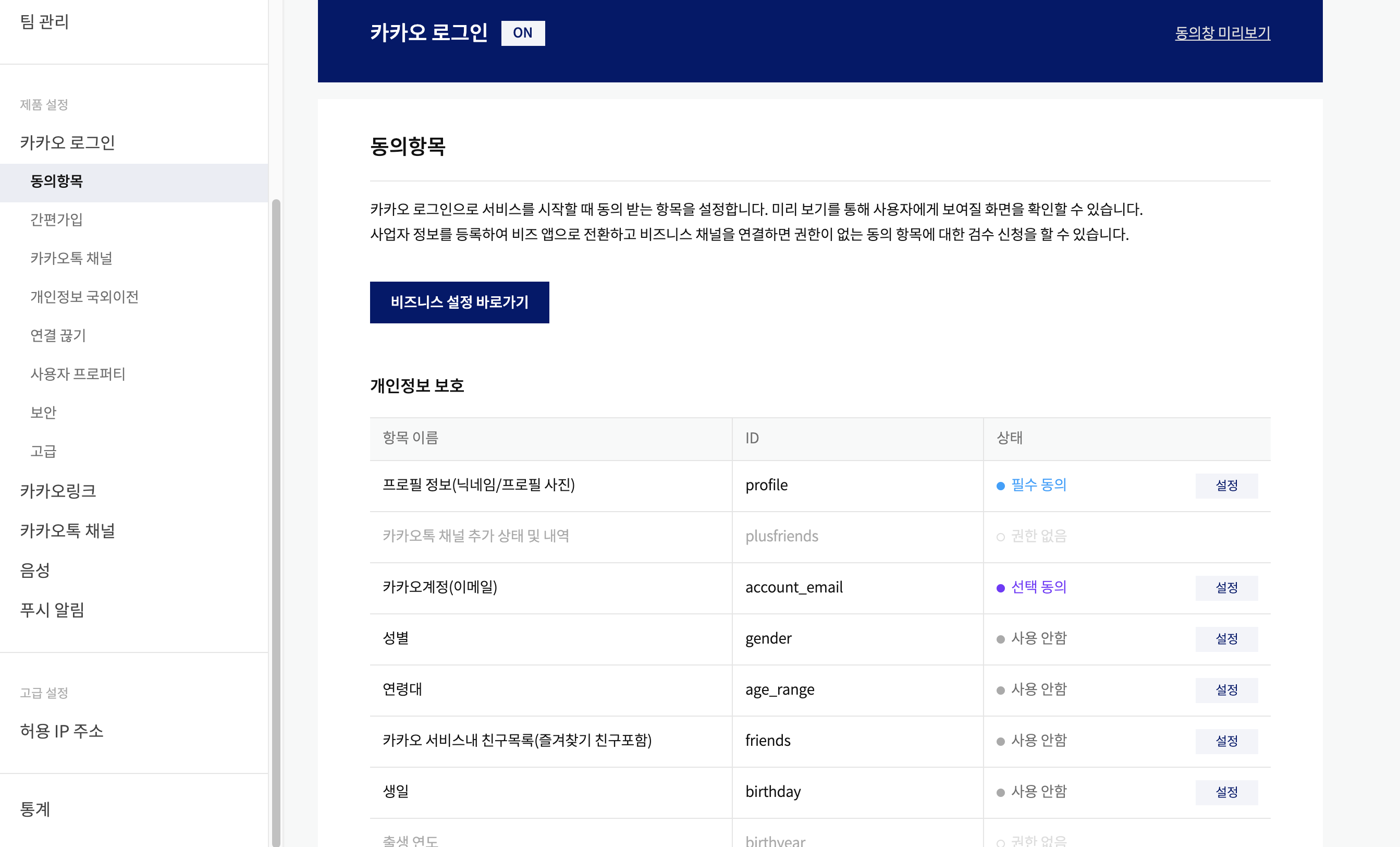 다음으로 내 앱에 카카오 로그인 API를 활성화하고, 카카오 로그인할 때 사용자 정보 중 가져올 정보를 선택합니다.