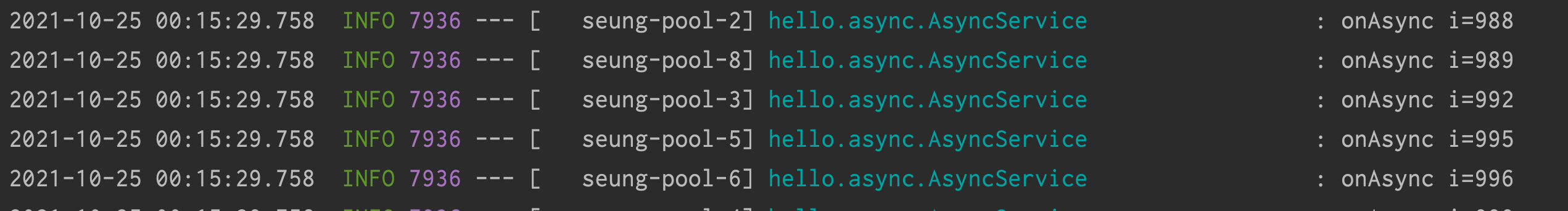 스레드 접두사가 "seung-pool-"로 고정되었고, 비동기 작업 시 다른 스레드를 사용하는 것을 알 수 있습니다.